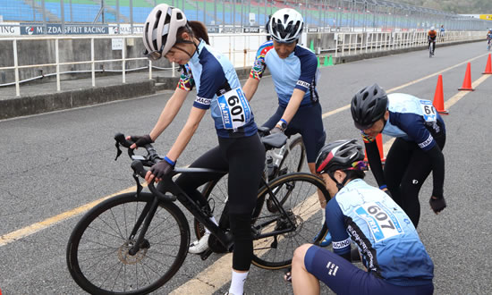 - スタート前にブレーキ、タイヤ空気圧は正常か、異常な音はしないかなど自転車の安全点検を済ま せます。つぎに、服装や靴ひも、計測装置などのチェックをしておきましょう。