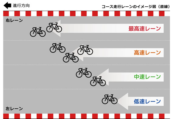岡山国際サーキットのコースを反時計回りで競技を行います。ゆっくり走る方はコース左側のレーンを、前走者を追い越す場合は右側のレーンから追い越します。追い越した後はしばらく右側のレーン走行を維持します。サーキットには一般道路のように車線を区切るラインはありませんが、4本のラインで仕切られた走行レーンを走るイメージで走ってください。