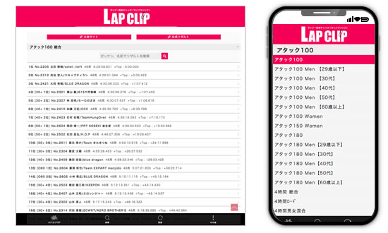 ラップ一覧チェックサイト〈LAP CLIP〉は、スマートフォンやタブレットなどで参加者のラップタイムが一覧表やグラフ形式でリアルタイムに確認できるサービスです。また、エンデューロでは記録証を、アタックでは完走証のダウンロードが可能です。